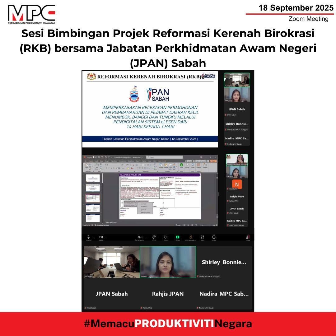 Terdapat dua projek RKB yang telah didaftarkan oleh JPAN Sabah. Projek pertama dilaksanakan oleh Bahagian Kerajaan Digital (BKD) dengan tajuk “Memperkasakan Kecekapan Permohonan dan Pembaharuan di Pejabat Daerah Kecil Tamparuli, Menumbok dan Banggi melalui Pendigitalan Sistem eLesen daripada 14 hari kepada 3 hari.” Projek ini bertujuan untuk mempercepatkan tempoh proses permohonan dan pembaharuan lesen melalui penggunaan sistem digital yang lebih cekap serta responsif. Projek kedua pula dikemukakan oleh Bahagian Saraan dan Pencen dengan tajuk “Meningkatkan Kecekapan Proses Kelulusan Permohonan Rawatan daripada Manual kepada Pendigitalan melalui Sistem eRawatan.” Inisiatif ini memberi tumpuan kepada usaha menambah baik proses kelulusan permohonan rawatan dengan menggantikan kaedah manual kepada sistem pendigitalan yang lebih teratur, cepat dan telus. Pelaksanaan kedua-dua projek ini jelas memperlihatkan komitmen JPAN Sabah dalam memodenkan sistem tadbir urus, meningkatkan keberkesanan proses kerja serta memperkukuh keupayaan penyampaian perkhidmatan awam melalui transformasi digital yang menyeluruh.. Sesi ini memberi penekanan kepada bimbingan teknikal dan kaedah penyediaan laporan projek RKB secara lengkap, merangkumi Fasa 1 hingga Fasa 5. Pegawai JPANS telah diberi panduan mengenai pemetaan proses semasa, pengenalpastian isu utama, penetapan objektif reformasi, dan penyediaan cadangan penyelesaian. Fokus khusus diberikan kepada komponen Kos Pematuhan, iaitu elemen penting dalam memastikan cadangan reformasi bukan sahaja praktikal tetapi juga realistik dari sudut implikasi kewangan, kemampanan, dan keberkesanan jangka panjang. #SabahProduktifSabahMajuJaya