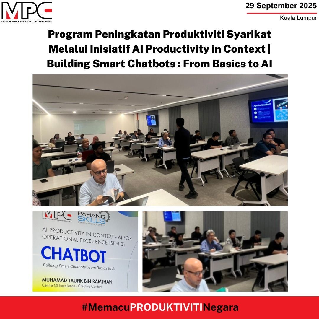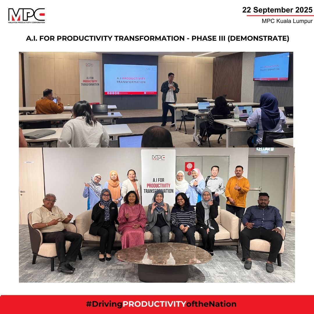 The A.I. for Productivity Transformation programme run in partnership with the education and professional services sectors equipped education businesses and women entrepreneurs with digital and AI-driven tools to strengthen branding, streamline workflows, and improve communication. By positioning digitalisation and AI adoption as enablers of higher productivity, MPC reinforced its role as a guide and advisor, supporting participating businesses to measure, track, and continuously enhance their productivity for greater competitiveness and sustainable growth. A total of 10 improvement or proof-of-concept (POC) projects have been submitted using appropriate AI technologies. To ensure company-level success and measurable productivity gains, DPN will conduct ongoing monitoring in line with the programme’s objectives. #MPC #AIProduktiviti #MPCProductive #Drivingproductivityofthenation