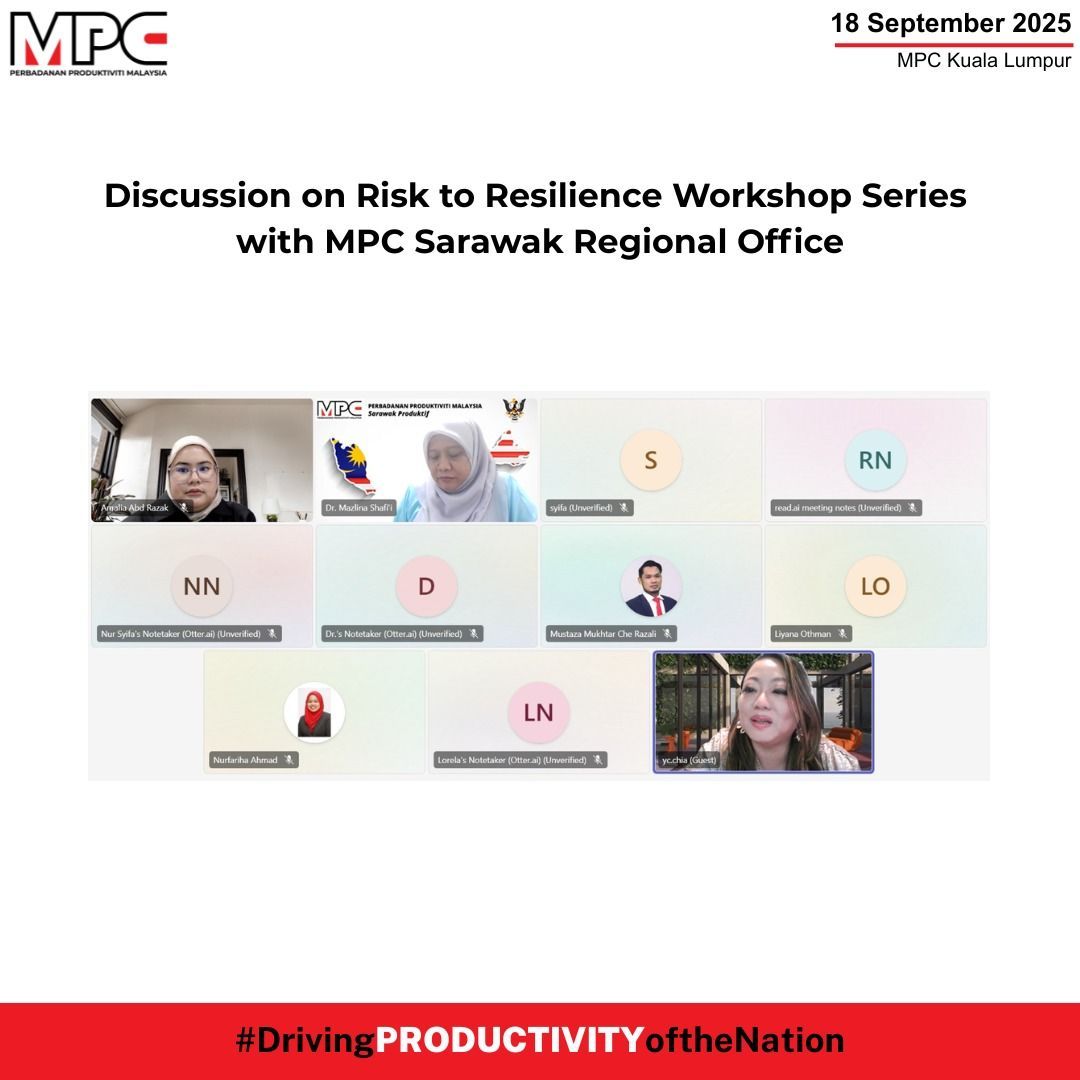 MEPN held a discussion with the MPC Sarawak Regional Office on the upcoming Risk to Resilience Workshop Series to be held in October 2025. The session focused on seeking collaboration in promoting the series and engaging local industries to participate. The initiative will serve as a platform to strengthen business resilience and productivity among enterprises in Sarawak. Through this partnership, MEPN aim to reach a wider pool of industry players, ensuring that more businesses are equipped with the right knowledge, tools, and frameworks to anticipate risks and transform them into opportunities for sustainable productivity growth.