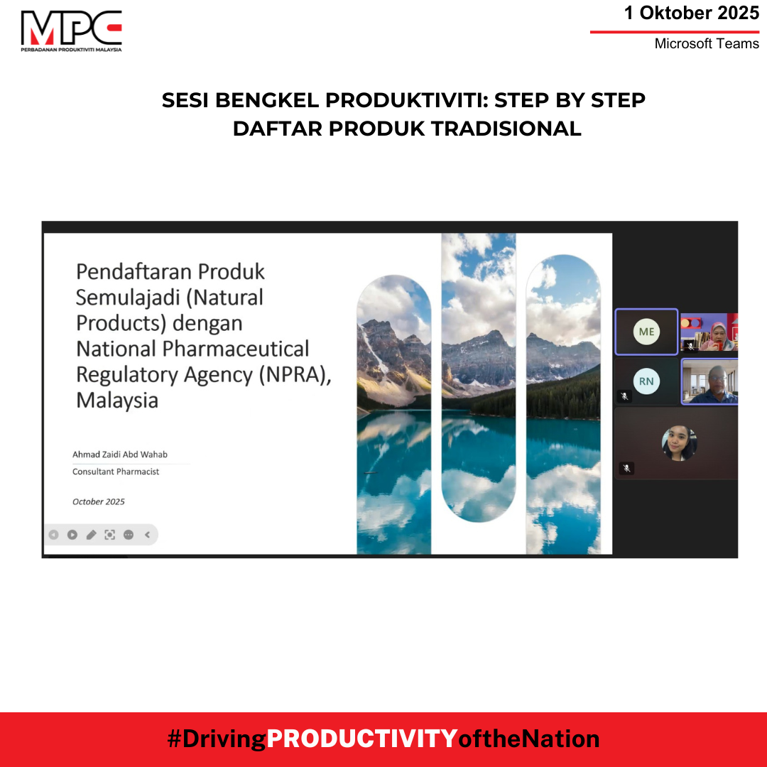 Sesi Bengkel Produktiviti: Step by Step Daftar Produk Tradisional telah diadakan bersama syarikat MH Saujana dan Nusantara Gamat. Bengkel ini bertujuan memberi pendedahan kepada syarikat mengenai proses pendaftaran produk tradisional secara lebih sistematik serta selaras dengan garis panduan yang ditetapkan oleh National Pharmaceutical Regulatory Agency (NPRA). Hasil bengkel menunjukkan usahawan berjaya memahami langkah-langkah penting dalam proses pendaftaran, termasuk penyediaan dokumen sokongan dan standard keselamatan produk. Usahawan turut berkongsi cabaran yang dihadapi, dan melalui sesi interaktif, beberapa penyelesaian praktikal telah dikenal pasti. Pendedahan ini memberi keyakinan untuk mempercepatkan proses kelulusan produk di pasaran. Sebagai way forward, PPN akan membantu syarikat MH Saujana melalui projek perintis (pilot project) untuk menangani isu pendaftaran produk dalam sistem NPRA. Produk tersebut sebelum ini gagal didaftarkan kerana masalah bahan mentah (raw material). Dengan sokongan teknikal dan pemantauan khusus, inisiatif ini diharap dapat mengatasi halangan tersebut serta meningkatkan produktiviti dan peluang pasaran syarikat.