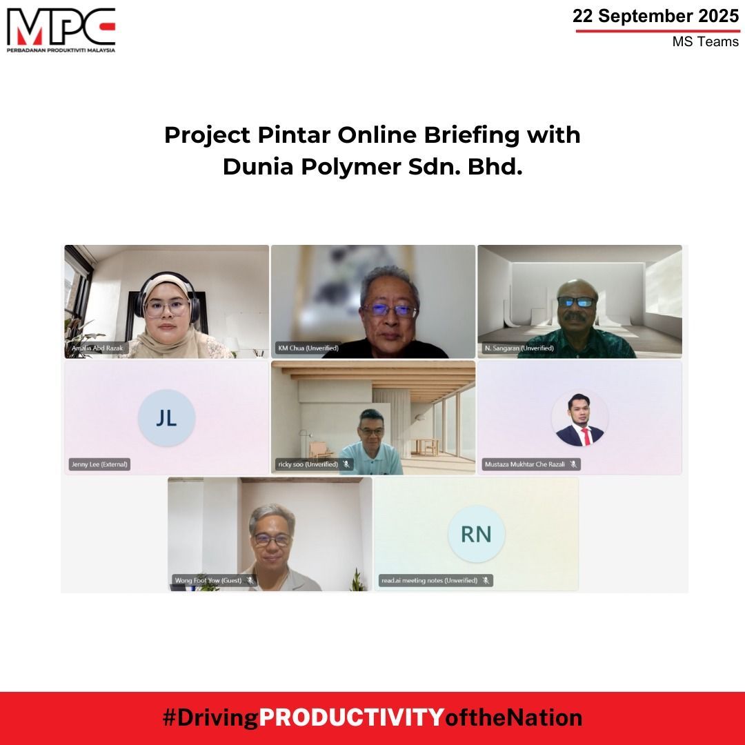 MEPN conducted an online briefing with Dunia Polymer Sdn. Bhd. as part of the ongoing Project Pintar initiatives. The session served to introduce the objectives and framework of Project Pintar, while engaging the company in discussions on potential productivity improvement strategies tailored to their operations. This engagement reflects MEPN’s commitment to fostering collaboration with industry players in driving productivity growth and operational excellence within the machinery and equipment (M&E) ecosystem