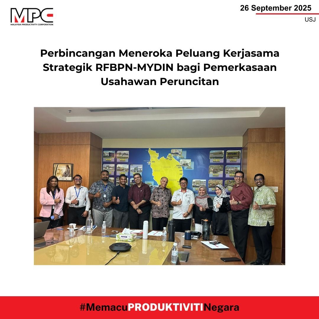 Tarikh: 26 September 2025 Masa: 3.00 petang Tempat: MYDIN USJ Perbincangan ini dipengerusikan oleh YBhg. Datuk Wira (Dr.) Haji Ameer Ali Mydin, Pengarah Urusan MYDIN Mohamed Holdings Berhad, dengan fokus kepada penerokaan kerjasama strategik antara RFBPN dan MYDIN. Sesi ini menekankan usaha memperkasa usahawan peruncitan melalui penerapan teknologi digital, selaras dengan objektif meningkatkan produktiviti serta daya saing industri. Antara inisiatif utama yang dibincangkan adalah Program AI Produktiviti yang berfungsi sebagai platform untuk membantu subsektor peruncitan beralih kepada operasi pintar dengan memanfaatkan teknologi AI dalam meningkatkan kecekapan operasi dan pengurusan sumber. Sebagai langkah susulan, RFBPN dan MYDIN telah bersetuju untuk memberi tumpuan khas kepada tiga bahagian pengurusan utama MYDIN dalam pelaksanaan inisiatif AI. Pendekatan ini akan memastikan integrasi teknologi dapat dijalankan secara menyeluruh, diurus dengan lebih sistematik, serta dipantau secara berterusan. Melalui fokus yang lebih terarah ini, transformasi operasi dijangka dapat dipercepatkan, pengurusan sumber diperkasakan, dan impak produktiviti yang ketara dapat dicapai oleh organisasi.