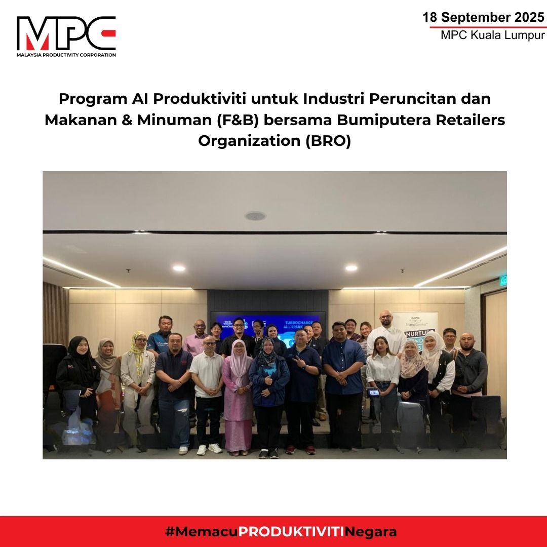 Tarikh: 18 September 2025, Khamis Masa: 9.00 pagi – 5.00 petang Tempat: MPC Kuala Lumpur Retail and F&B Productivity Nexus (RFBPN) telah menganjurkan Program AI Produktiviti yang memberi tumpuan kepada subsektor Peruncitan dan Makanan & Minuman (F&B), dengan penglibatan aktif daripada Bumiputera Retailers Organization (BRO). Melalui sesi interaktif, peserta didedahkan kepada aplikasi AI dalam perniagaan dan bagaimana teknologi ini dapat menyokong peningkatan produktiviti serta daya saing syarikat. Sebagai langkah seterusnya, RFBPN bersama BrandGeeks akan melaksanakan projek penambahbaikan dan projek rintis (POC) bersama 15 syarikat terpilih, serta memantau keberkesanannya bagi memastikan impak berterusan terhadap produktiviti dan pertumbuhan perniagaan.