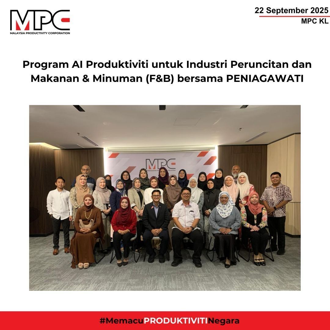 Tarikh: 22 September 2025, Isnin Masa: 9.00 pagi – 4.00 petang Tempat: MPC Kuala Lumpur Retail and F&B Productivity Nexus (RFBPN) dengan kerjasama PENIAGAWATI telah menganjurkan Program AI Produktiviti yang memberi tumpuan khusus kepada subsektor Peruncitan dan Makanan & Minuman (F&B). Melalui sesi pembelajaran interaktif, peserta – terdiri daripada usahawan dan peniaga kecil – diberi pendedahan praktikal tentang penggunaan teknologi AI, termasuk penghasilan arahan (prompt), analisis data asas, pembangunan bahan pemasaran digital, serta aplikasi lain yang menyokong produktiviti dan daya saing perniagaan. Sebagai kesinambungan daripada sesi ini, sebanyak 25 projek penambahbaikan atau POC telah dicadangkan dengan menggunakan teknologi AI yang bersesuaian. Bagi memastikan kejayaan serta peningkatan produktiviti di peringkat syarikat dapat dicapai oleh usahawan terlibat, pemantauan berterusan akan dilaksanakan oleh RFBPN selaras dengan objektif yang telah ditetapkan.
