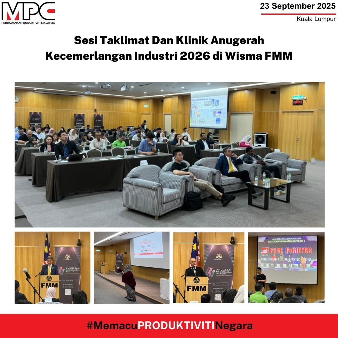Program dirasmikan oleh YBhg. Dato’ Gan Tack Kong, Pengerusi Federation of Malaysian Manufacturers (FMM), dengan kehadiran lebih 50 wakil syarikat ahli. Inisiatif mempromosi AKI menyokong aspirasi FMM melahirkan 100 Perusahaan Kecil dan Sederhana (PKS) yang bersedia ke pasaran modal menjelang 2030, selaras dengan komposisi ahli FMM yang kira-kira 75% terdiri daripada PKS. AKI bukan sekadar anugerah, malah berfungsi sebagai batu loncatan untuk penanda aras prestasi, pembinaan kredibiliti dan peningkatan kebolehpasaran produk. Penerangan ringkas mengenai Malaysia Business Excellence Framework (MBEF) oleh Pengarah MPC, Puan Saliza Saari, memberi panduan praktikal untuk memperkukuh pengurusan dan menjadi rujukan penting kepada syarikat yang ingin bersaing dalam AKI 2026. Selain itu, taklimat ESG disampaikan oleh Puan Nur Adani Mohd Hasran, Timbalan Pengarah Kanan, Bahagian Industry Environmental, Social and Governance (MITI). Dr. Mohd Razip Abdullah, Jurutera SIRIM, pula membentangkan Industry4WRD. Sesi klinik turut menampilkan perkongsian amalan terbaik oleh pemenang AKI 2024—CTRM Aero Composites Sdn Bhd dan Fire Fighter Industry Sdn Bhd—sebagai rujukan persediaan dan perjalanan penyertaan menuju AKI 2026.