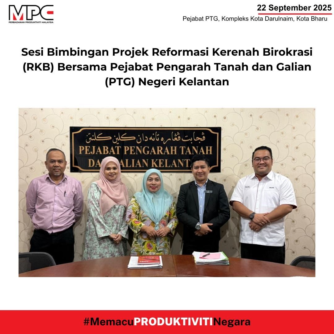 Sesi bimbingan projek Reformasi Kerenah Birokrasi (RKB) bersama Pejabat Pengarah Tanah dan Galian (PTG) Negeri Kelantan telah diadakan bagi menilai kemajuan serta keberkesanan pelaksanaan projek. Perbincangan memberi tumpuan kepada analisis proses untuk mengenalpasti prestasi semasa bagi dua projek utama iaitu: 1. Mengurangkan Kos Pematuhan Proses Pindahmilik Tanah Bagi Individu Bukan Melayu & Individu Bukan Kelahiran Negeri Kelantan. 2. Mempercepat Proses Pindahmilik Tanah Antara Keluarga Terdekat Bagi Individu Bukan Melayu & Individu Bukan Kelahiran Negeri Kelantan. Pada sesi kali ini, analisis dibuat melalui pemetaan proses untuk mengenalpasti prestasi semasa bagi setiap projek. Sesi susulan akan menekankan kepada pengenalpastian isu dan permasalahan yang dihadapi, serta perbincangan mengenai cadangan penyelesaian yang lebih berkesan. Proses bimbingan dan perbincangan ini turut disokong dengan penggunaan teknologi Kecerdasan Buatan (AI) bagi membantu dalam menganalisa data, menjana idea, penyediaan dokumen, dan pembangunan borang yang relevan. Pendekatan ini dijangka dapat mempercepat proses reformasi serta meningkatkan kualiti hasil kerja. Secara keseluruhannya, Reformasi Kerenah Birokrasi (RKB) merupakan inisiatif untuk meningkatkan kecekapan, ketelusan, dan keberkesanan pentadbiran melalui semakan semula peraturan sedia ada. Usaha ini diharap dapat memperkukuh mutu perkhidmatan awam, sekaligus melonjakkan produktiviti dan kesejahteraan rakyat.