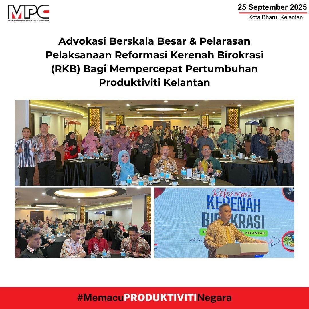 Program Advokasi Berskala Besar & Pelarasan Pelaksanaan Reformasi Kerenah Birokrasi (RKB) Peringkat Negeri Kelantan telah dilaksanakan pada 25 September 2025. Program ini bertujuan memperkukuh kefahaman kakitangan perkhidmatan awam negeri terhadap agenda kerajaan dalam usaha meningkatkan kecekapan penyampaian perkhidmatan awam melalui program RKB seterusnya memperluas pelaksanaannya di negeri Kelantan. Program kolaborasi strategik antara MPC dan Pejabat Setiausaha Kerajaan Negeri Kelantan ini telah menghimpunkan seramai 100 peserta dari pelbagai jabatan dan agensi kerajaan negeri termasuk Jabatan Negeri, Pihak Berkuasa Berkanun Negeri, Pejabat Tanah dan Jajahan, Pihak Berkuasa Tempatan, serta bahagian-bahagian di Pejabat SUK. Penyertaan yang menyeluruh ini membuktikan komitmen bersama untuk melaksanakan RKB secara lebih sistematik dan inklusif. Dalam ucapan amanat YBhg Dato’ Timbalan Setiausaha Kerajaan (Pengurusan) Negeri Kelantan, Dato’ Ab Pattah Hasbullah yang juga merangkap Ketua Pegawai Reformasi (CRO) negeri, beliau menyambut baik pelaksanaan program RKB dan menekankan peri pentingnya usaha bersepadu untuk mempercepat reformasi pentadbiran dan meningkatkan daya saing negeri. Seterusnya, pihak MPC telah menyampaikan taklimat berfokus kepada Pelaksanaan RKB Bagi Memacu Pertumbuhan Produktiviti serta Aplikasi Generative AI dalam Projek RKB, sebagai langkah memperkasa penggunaan teknologi baharu dalam pengurusan perubahan. Sebagai output program ini, beberapa cadangan projek baharu RKB telah berjaya dirangka dengan bantuan teknologi AI. Inisiatif ini bukan sahaja mengukuhkan pemahaman peserta terhadap konsep pelaksanaan RKB, tetapi juga meningkatkan kompetensi mereka dalam mengaplikasikan AI untuk mempercepatkan proses inovasi pentadbiran. Kerajaan Negeri Kelantan menegaskan komitmennya untuk memperluas pelaksanaan RKB ke seluruh jabatan dan agensi negeri. Usaha ini diharap dapat menambah baik kecekapan penyampaian perkhidmatan kerajaan, memudahkan urusan perniagaan dan rakyat, serta menyokong agenda memacu pertumbuhan produktiviti negeri secara mampan.